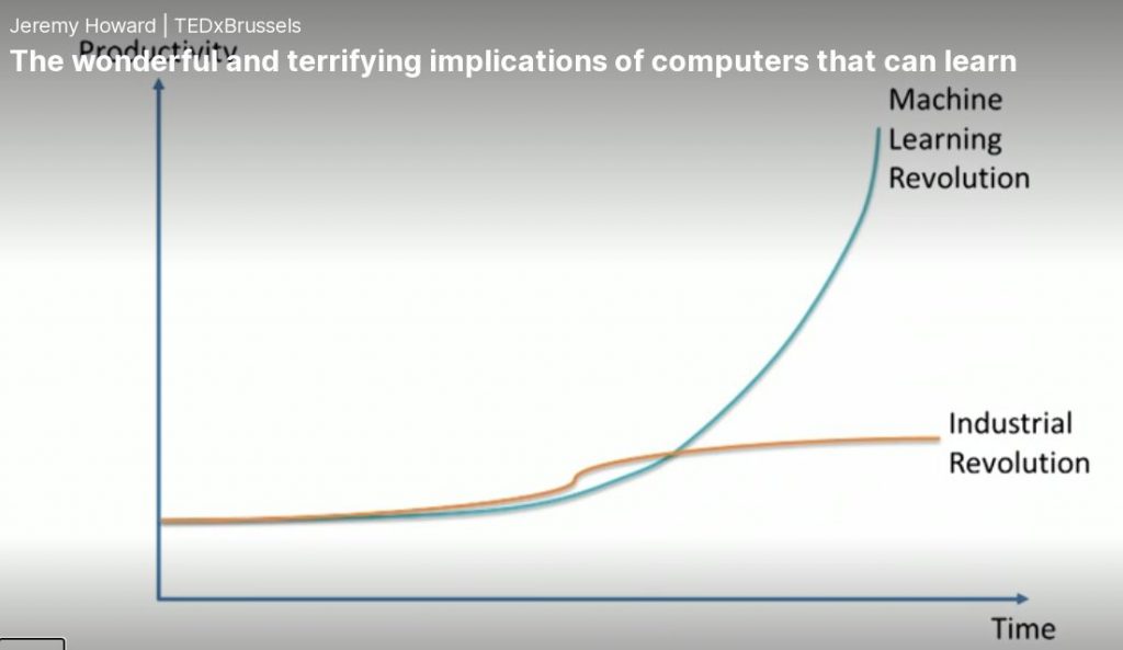 - La evolución y desempeño que permite deep learning en una gráfica Productividad/Tiempo es exponencial (deep learning generará más y mejor output de manera creciente que el propio desempeño humano – ver gráfica abajo).